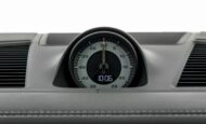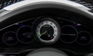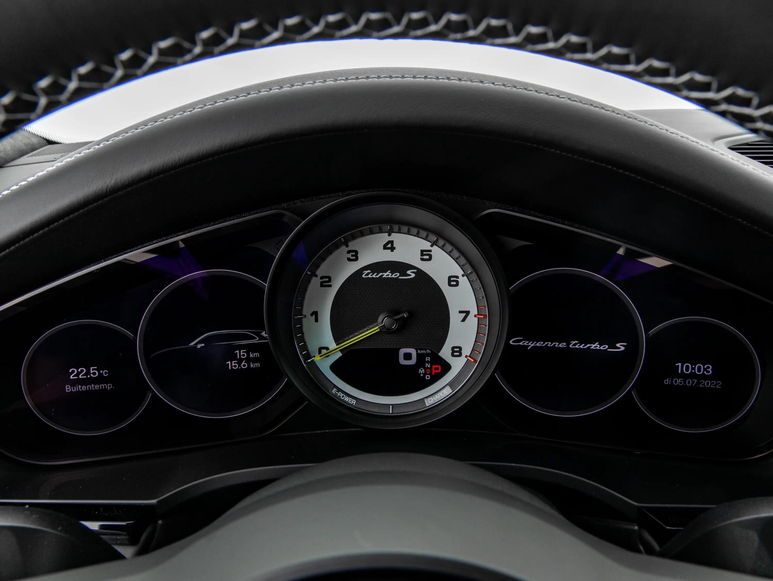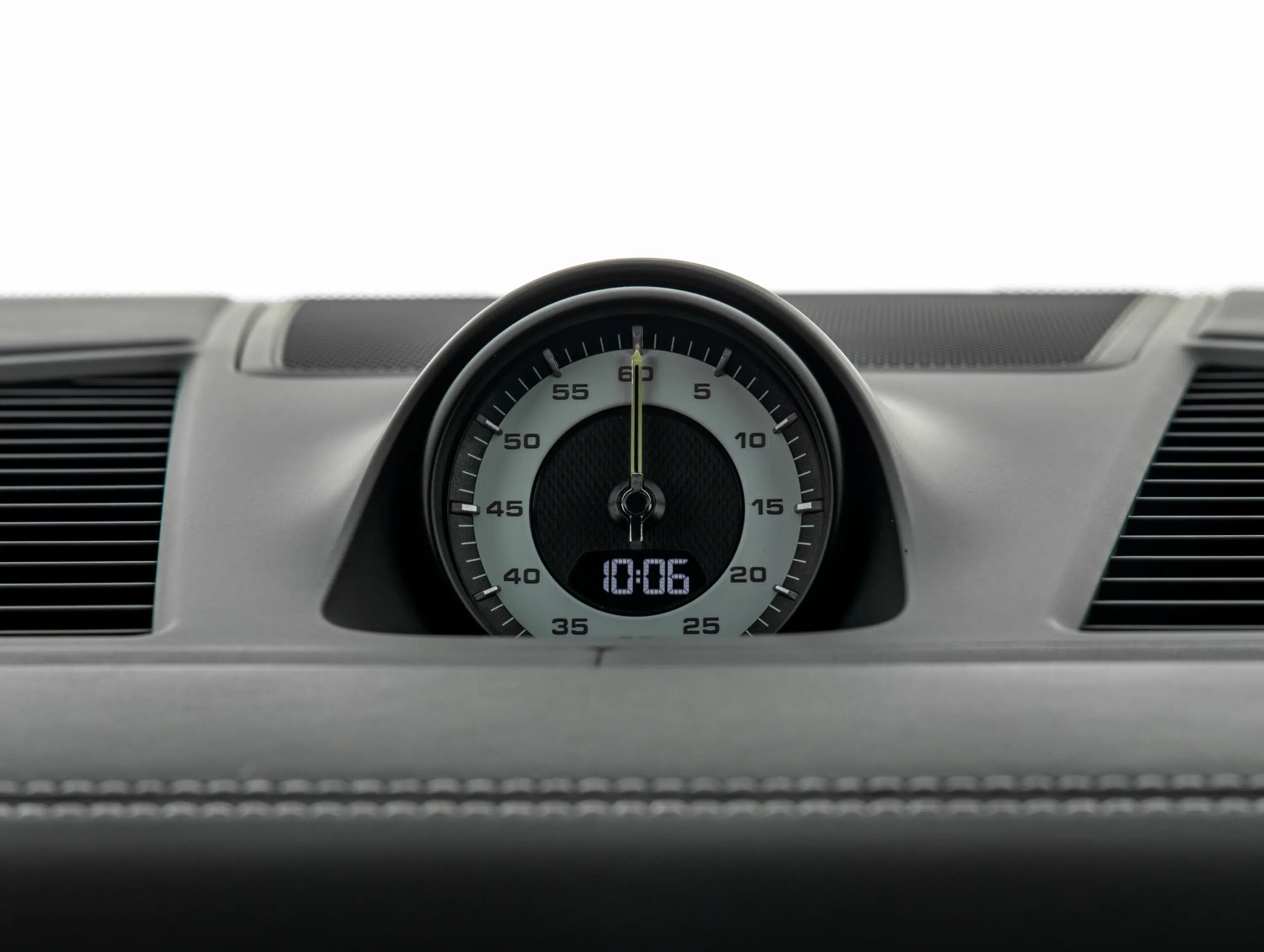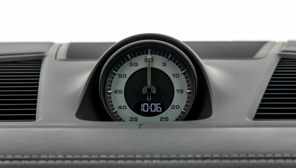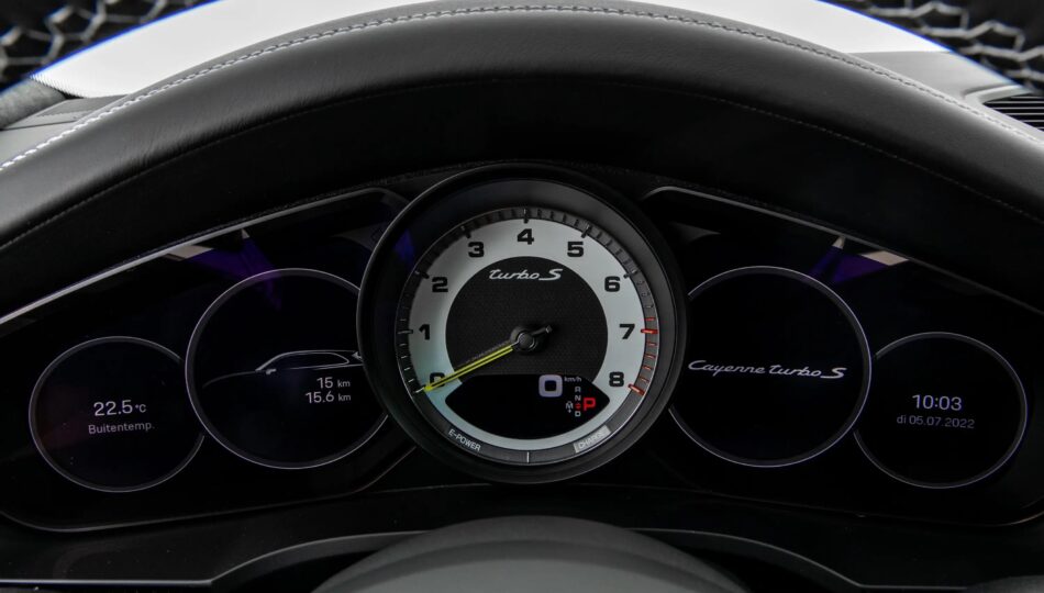 Cuentarrevoluciones analógico central con esfera negra, medidor de potencia, aguja en Acidgreen y logo ‘turbo S’