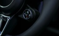 Cuentarrevoluciones analógico central con esfera negra, medidor de potencia, aguja en Acidgreen y logo ‘turbo S’